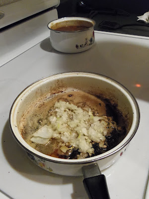 At this point in the night, our guests were just about to arrive and we didn't want to look like weeping old women so we opted to cut up the onion with a chopper. Our eyes thanked us. (We also minced the garlic at the same time.)